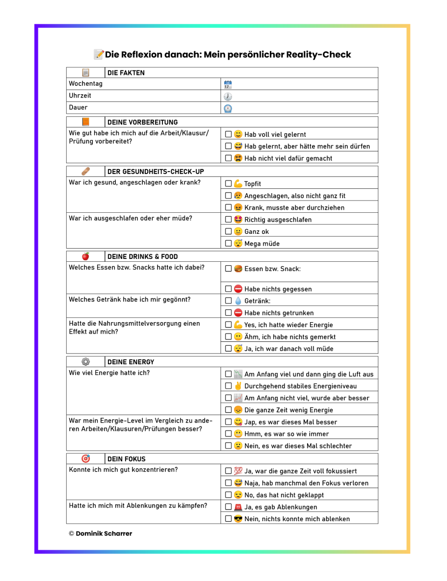 Die Note deiner Arbeit, Klausur oder Prüfung hängt von ganzen vielen Faktoren ab. Diese Checkliste hilft dir dabei, das Ganze zu reflektieren, sodass du die Einflüsse auf deine Note besser verstehst.