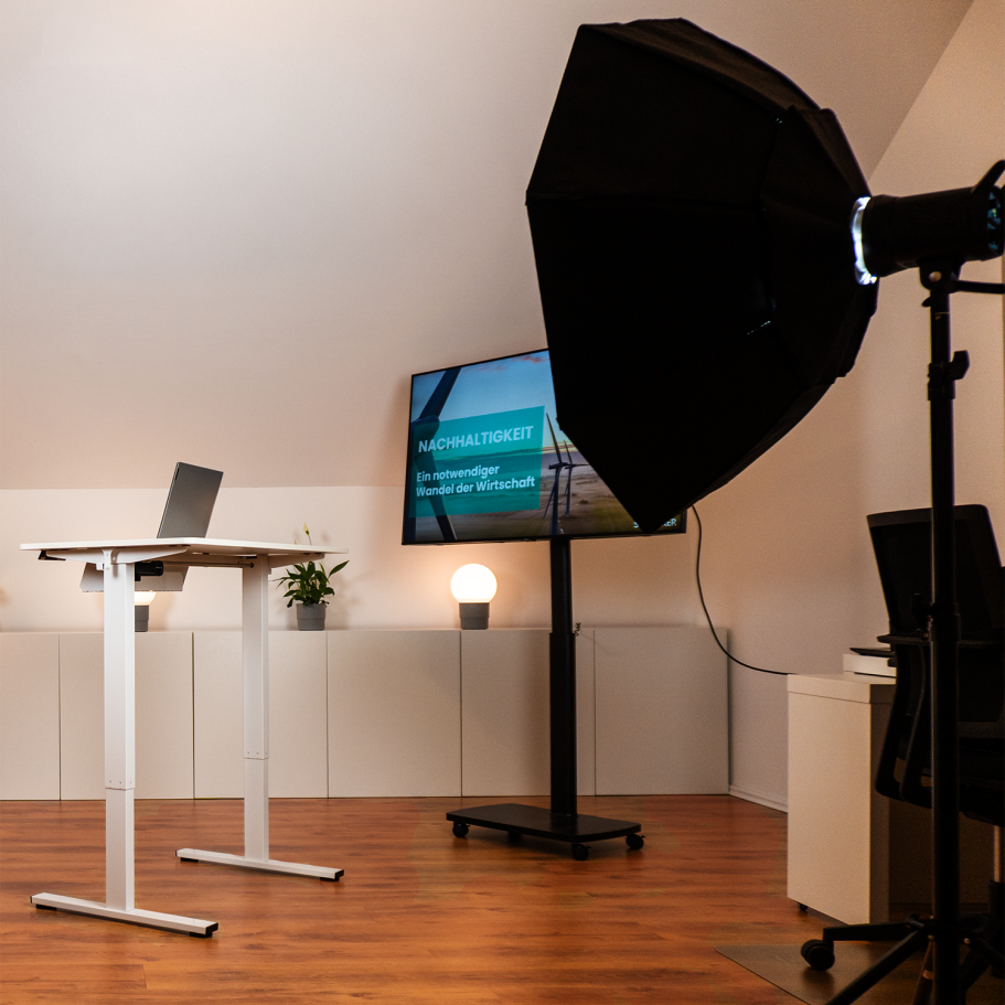 deshalb kommt anstatt eines Monitors ein TV-Bildschirm mit enormer Größe zum Einsatz. Damit landest du in Übergröße im Studio und eine viel natürlichere Interaktion kann stattfinden. Die Cyber-Barriere zerbröckelt.